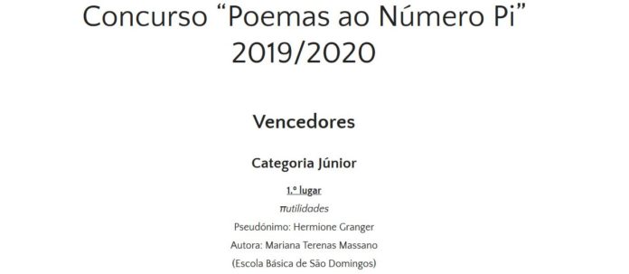 Na 2ª edição do “Festival da Matemática. Covilhã – Cidade do Pi”, foi mais uma vez promovido no Concelho o concurso “Poemas ao Número Pi”, onde os alunos da Escola de São Domingos se destacaram de forma brilhante, conseguindo conquistar os três melhores lugares na modalidade Júnior, num total de 148 poemas em concurso. Em primeiro lugar destacou-se a aluna Mariana Massano, do 9ºB, em segundo lugar a aluna Leonor Marques, do 8ºB, e em terceiro lugar o aluno Manuel Eduardo Silva, do 9ºC. É com imenso orgulho que o Agrupamento felicita os três vencedores do concurso, que se revelaram uns grandes poetas da Matemática!