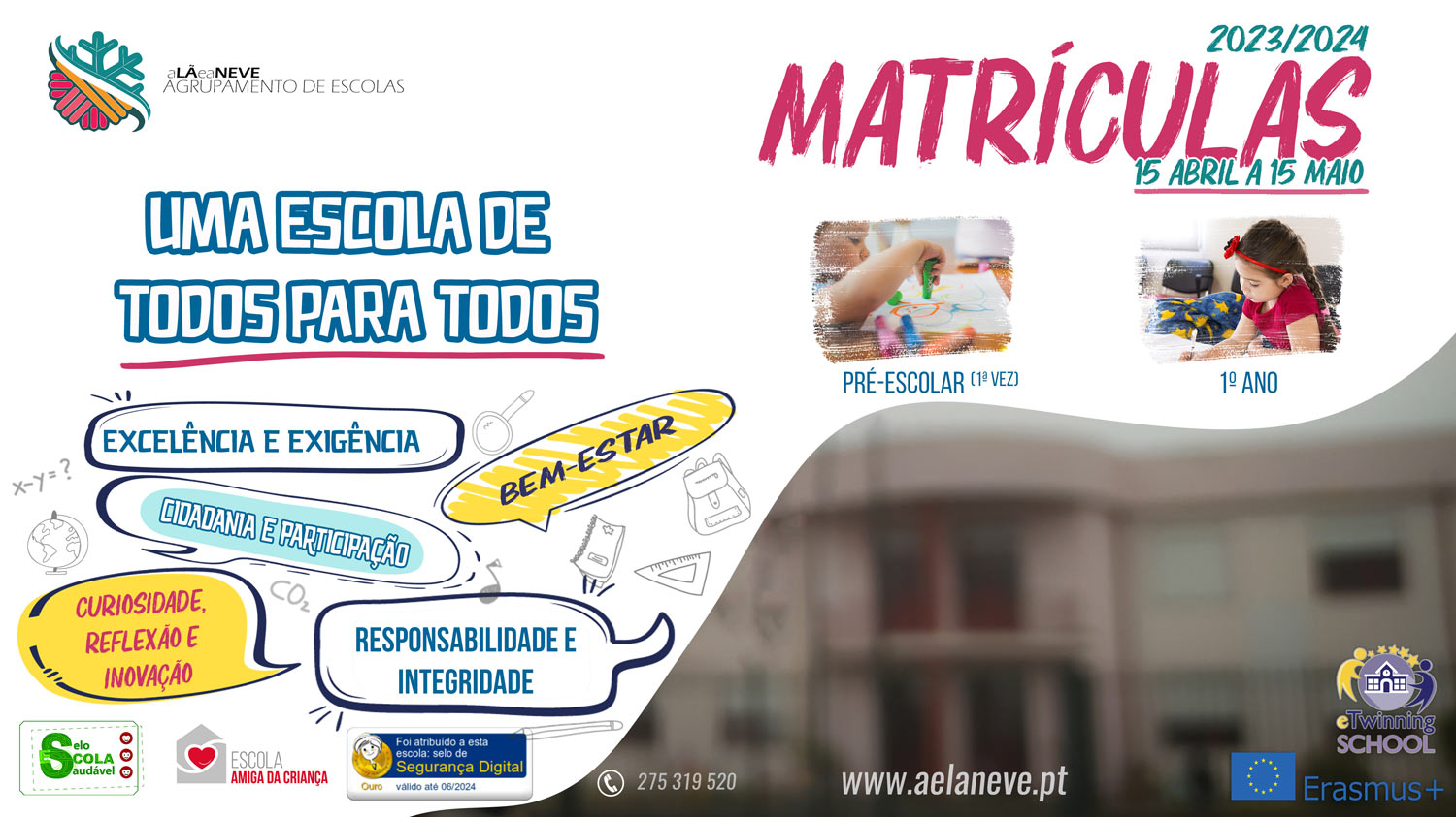 Informam-se todos os interessados que as matrículas para a educação pré-escolar e 1º ano do ensino básico, decorrerão entre os dias 15 de abril e 15 de maio.
