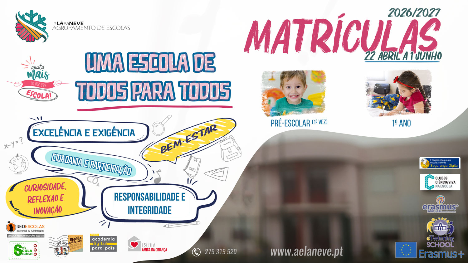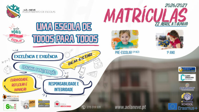 Informam-se todos os interessados que as matrículas para a educação pré-escolar e 1º ano do ensino básico, para o ano letivo 2026/2027 decorrerão entre os dias 22 de abril e 1 de junho.